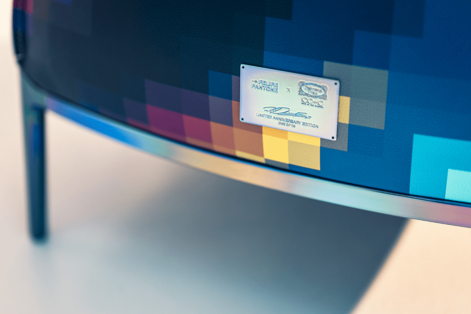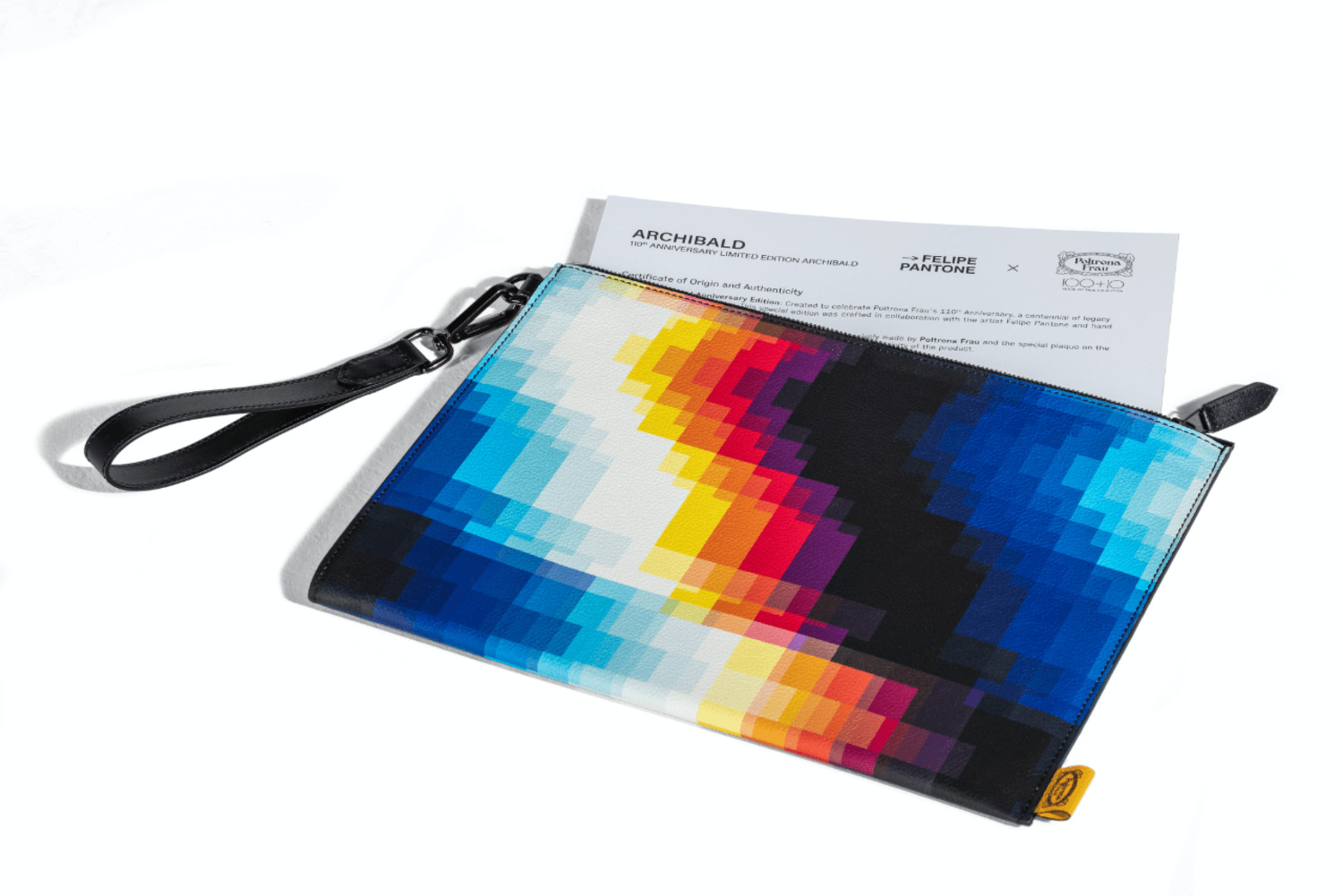 A precious tailor-made clutch in Pelle Frau® leather, printed with the same Felipe Pantone motif, that includes the armchair's hand-signed certificate of authenticity.
