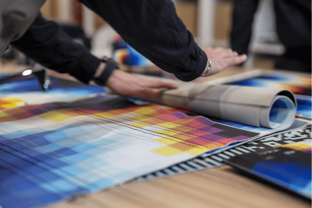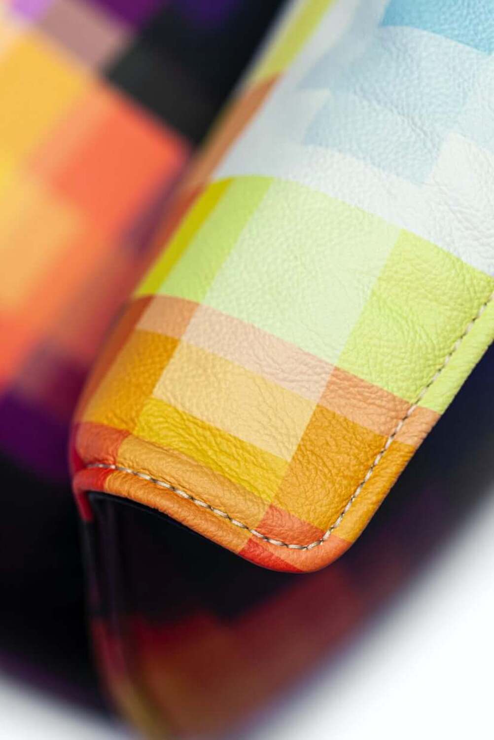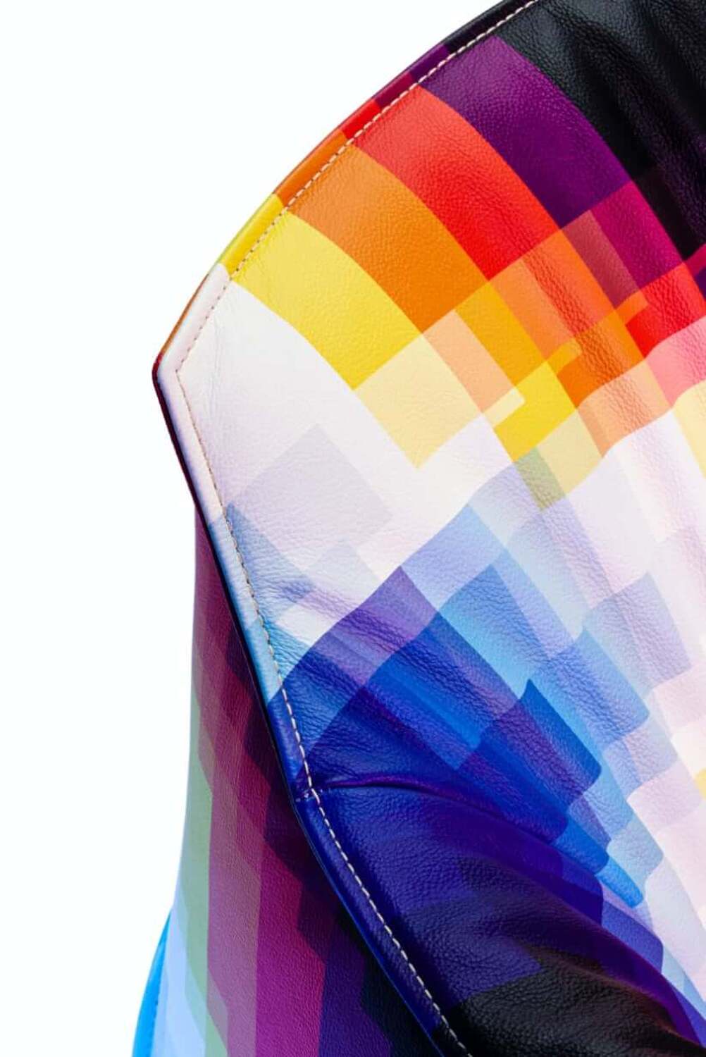 Pelle Frau® Leather, sprinkled with reds, oranges, yellows, whites and blues like a heat map. Metal becomes multi-color chrome: nuanced, iridescent and shimmering